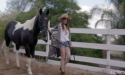 Fabulous auburn haired cowgirl licks dick and humped in the barn